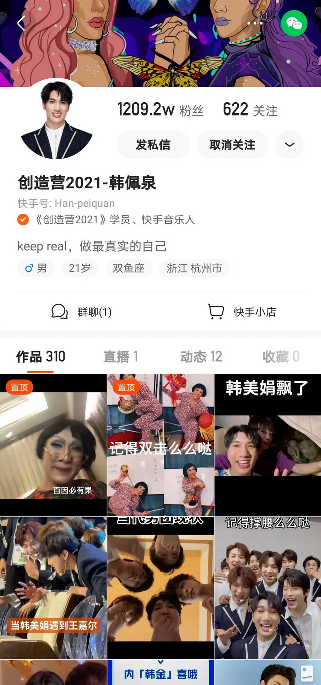在登上《创造营2021》的舞台前,韩佩泉就活跃在快手的舞台上,2020年的“快手大年夜”,他便身穿红裙,登台表演了《Black Sheep》。据快手娱乐相关负责人介绍,他在站内的影响力不一般,在身份转变为创造营学员后,他的视频播放量增长7000万。快手热榜最多一晚同时上5个热搜,还多次登顶TOP1。