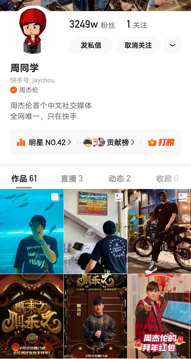 进入2020年,越来越多明星来到了快手。粉丝量级庞大,覆盖多个年龄层的周杰伦的入驻,是这一阶段的标志性事件,这也是周杰伦唯一入驻的中文社交媒体,此后他的第一次直播、独家回应黑评都发生在快手。