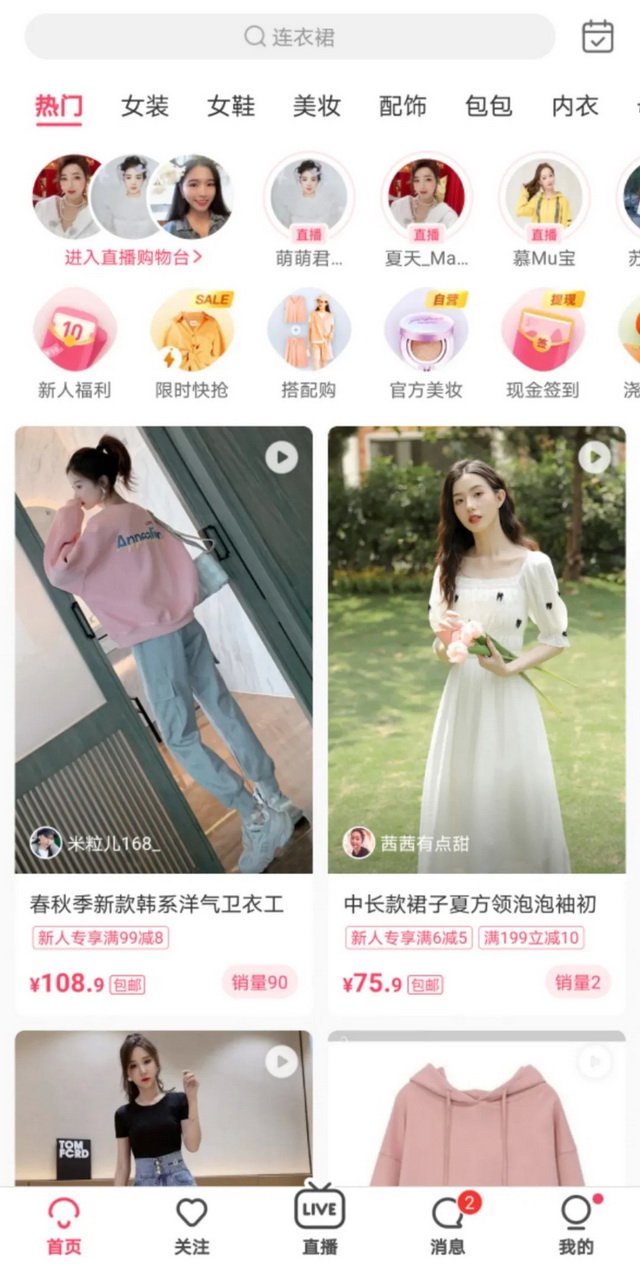 蘑菇街首页及直播购物台