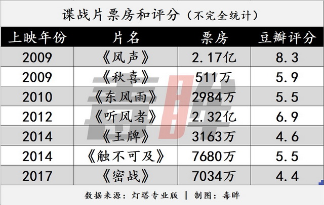 实际上,《风声》之后的几年,确实有《秋喜》《东风雨》《听风者》《智取威虎山》几部谍战电影接连上映,但总体上均不及《风声》反响热烈。
