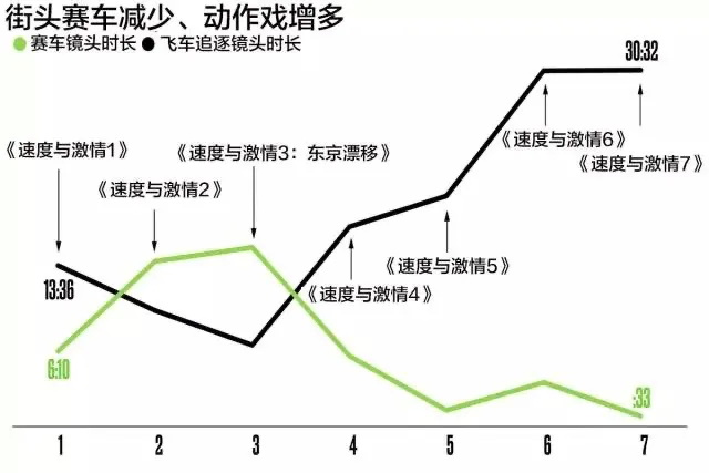 不管是注重直线加速,还是强调弯道飘移,前三部《速激》都还只是纯正的“赛车片”。据彭博社统计,第三部影片的赛车时长为系列最高,达到15分10秒,飞车追逐时间占比最低,为6.4%,到《速度与激情4》,这两个数字分别变成了5分45秒和15.9%。