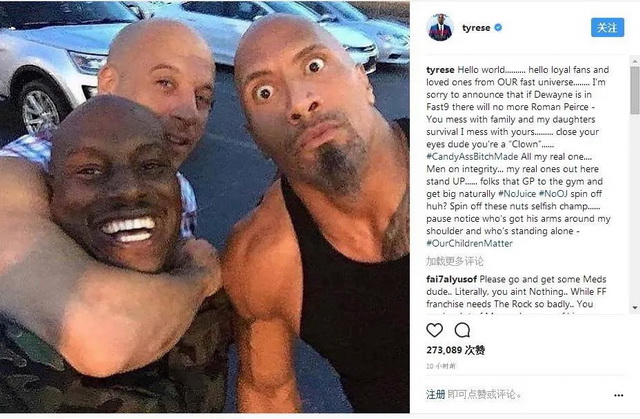 主演之一泰瑞斯·吉布森在INS发文指责强森“毁了这个大家庭”