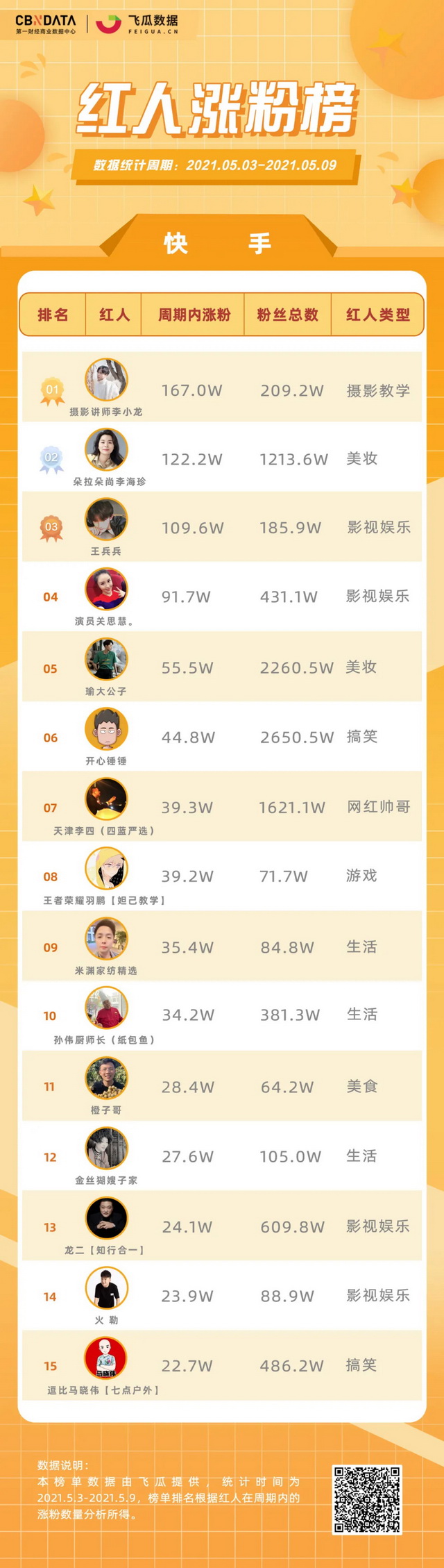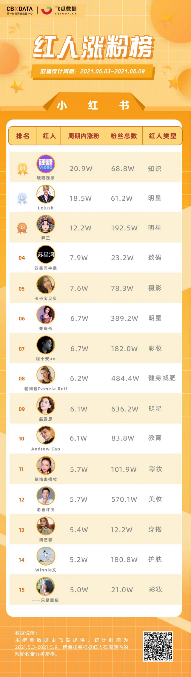 CBNData消费站联合飞瓜推出「红榜单」之「红人涨粉榜」,聚焦抖音、快手、小红书、B站4大平台,观察周期内各平台红人在内容产出上的特点以及涨粉趋势,为品牌人提供详细的数据参考。