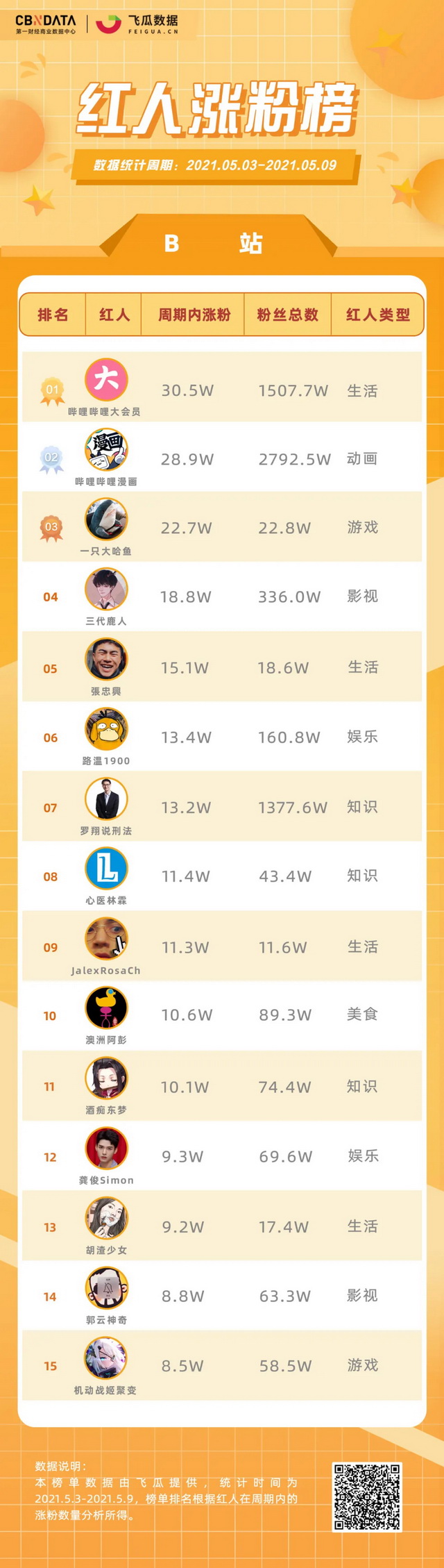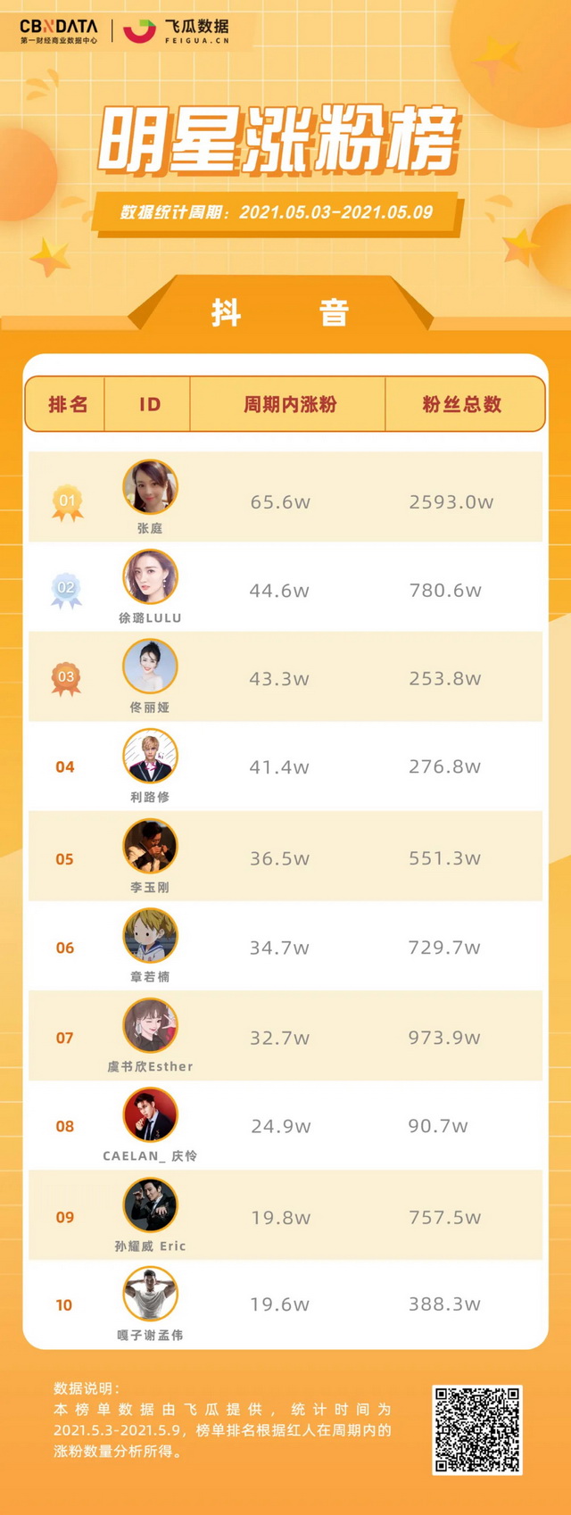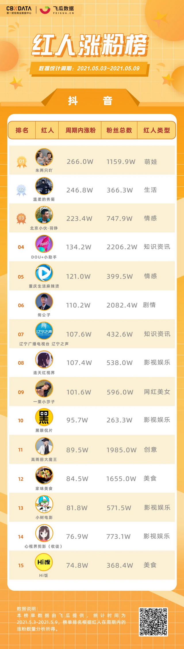 影视娱乐版块红人涨粉再爆发,前15席位中占据4位,是上榜红人数最多的行业类型。