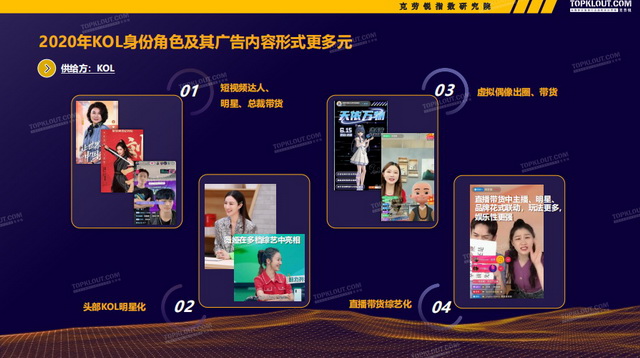 作为供给方的KOL,身份角色更为丰富,内容玩法也更加多样,短视频达人、明星、总裁纷纷入局直播带货,虚拟偶像也持续出圈试水带货。头部带货KOL则走向明星化道路,直播带货形式逐渐综艺化,KOL广告内容形式朝多元方向发展。