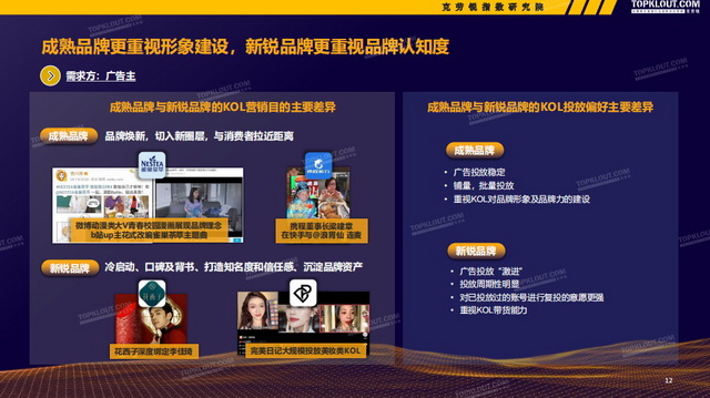 相对成熟的品牌KOL投放目的则更多是为了品牌焕新,切入新圈层,与消费者拉近距离,在选择KOL时也更加重视KOL对品牌形象及品牌力的建设,投放频次也会相对稳定。