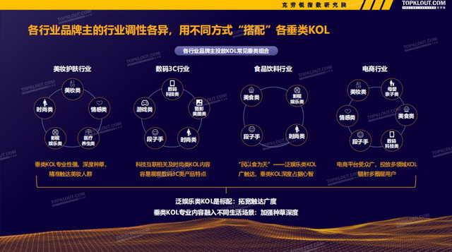 各行业品牌主根据行业调性,也在用不同方式“搭配”各垂类KOL。垂类KOL专业内容融入不同生活场景,种草深度得到加强。但不变的是,在拓宽触达广度上,泛娱乐类KOL成为标配。