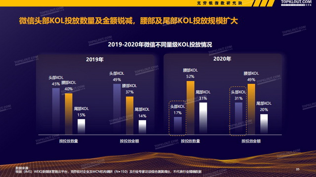 2020年,微信生态不断打通,视频号加速发展,品牌主投放选择增加,同时微信KOL营销价值也受到一定冲击。微信头部KOL投放数量及金额锐减,腰部及尾部KOL投放规模扩大。