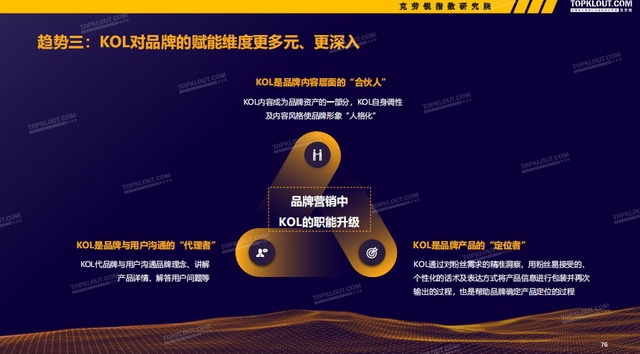 在品牌营销中,KOL的职能不断升级,面向产品,是内容层面的“合伙人” ;面向用户,是品牌沟通的“代理者”;面向市场,是品牌产品的“定位者” 。KOL,在营销市场中与品牌相辅相成。