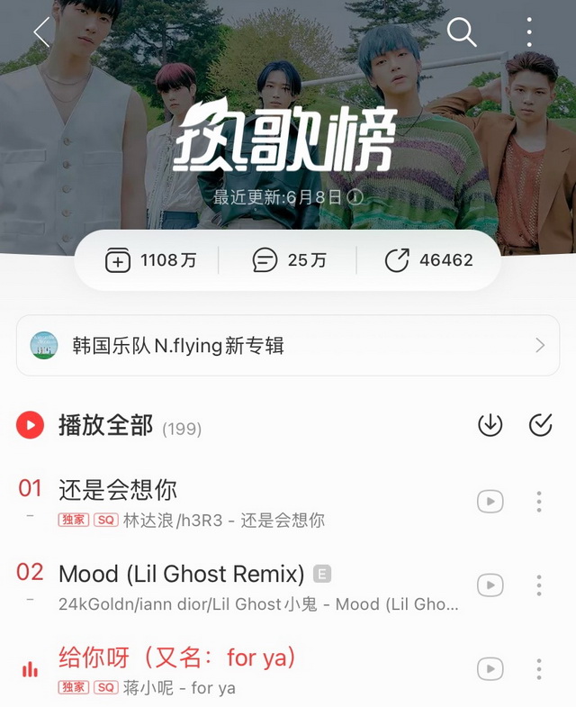 音乐平台的热歌榜上,也有不少歌曲是出自于抖音、快手等短视频平台,比如网易云音乐最新的热歌榜TOP3,《还是会想你》、《Mood》以及《给你》,都是在抖音平台,借助短视频的流量走红的。