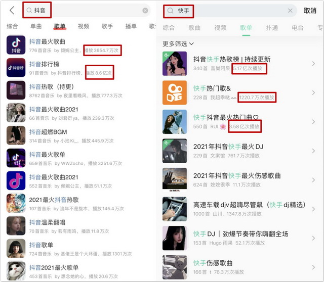 在网易云音乐和QQ音乐上以“抖音”、“快手”为关键词进行搜索,我们就可以发现不少歌单出现,比如“抖音最火歌曲”、“抖音热歌”、“快手最火歌曲2021”等等,不少歌单的播放量已经超千万,甚至破亿。