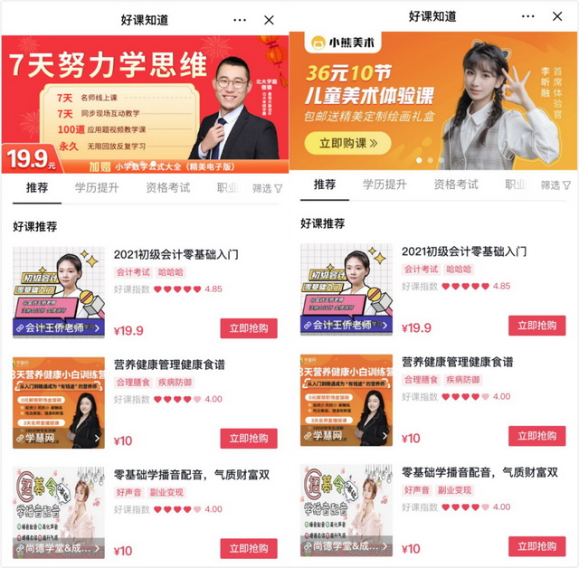 但如今我们再次点击这款小程序,可以发现分类栏中面向儿童的课程已然消失不见,取而代之的是学历提升、资格考试、兴趣生活等面向成年人的课程。在小程序首页能够看到的面向儿童的课程也只剩下了儿童美术体验课以及学霸思维养成课。
