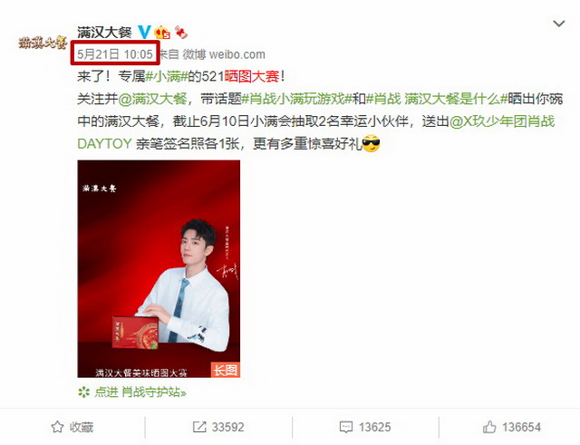 为了进一步撬动代言明星的影响力,在5月21日“小满”节气,也是品牌生日之际,满汉大餐再次与微博深度合作,携手肖战共同发起了#肖战小满玩游戏#话题大赛,与明星内容共创,瞬间激发起了粉丝参与的积极性。