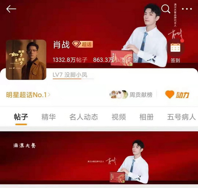 不仅如此,为了号召更多粉丝参与,满汉大餐通栏海报也出现在了肖战粉丝的大本营——超话社区中,吸引了更多粉丝前来打call助阵。