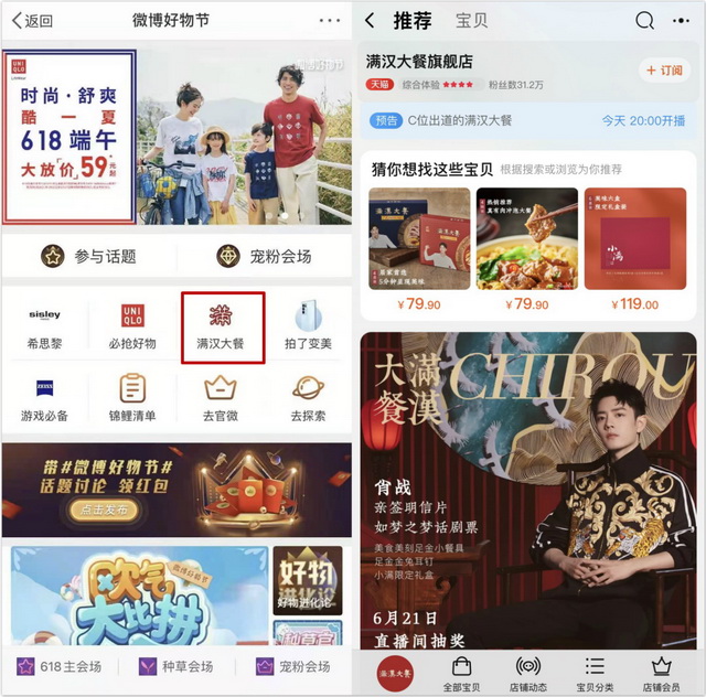 而且,为了触达更多潜在目标受众,在“微博好物节”主会场界面,还为满汉大餐设置了专属icon,点击即可直接导流至品牌电商平台,缩短了消费者的种草和电商转化链路,让用户种草、拔草两不误。