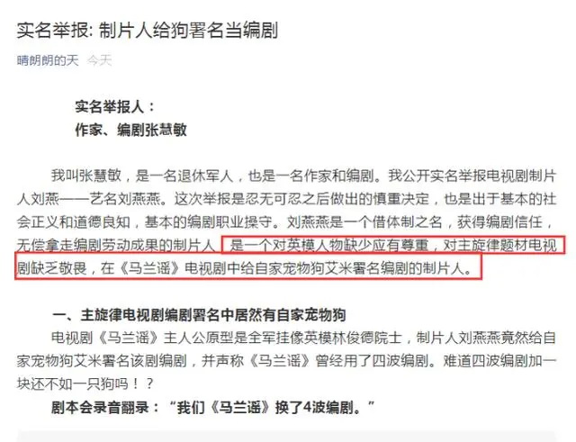 6月18日,编剧张慧敏实名举报在电视剧《马兰谣》中,制片人刘燕(艺名刘燕燕)竟然给其宠物狗“艾米”署名为编剧。
