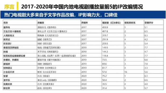 这几年,IP改编一直都是市场主流,不管是电影、网剧、网络电影还是短剧集,IP改编作品都占据了各大榜单的半壁江山。新华社6月份刚刚发布的《新华·文化产业IP指数报告(2021)》显示,TOP50的IP中有44部已经有至少一种长视频形式的影视化。CC-Smart新传智库发布的《2020中国IP泛娱乐开发报告》显示,2017-2020年国产热门电视剧大多来自于文学作品改编,播放量TOP5甚至全部来源于IP改编。