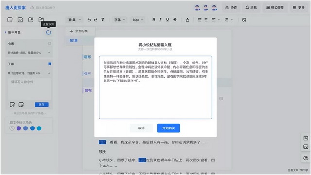 通过“小说转剧本”功能,创作者一键即可将小说文本转化为剧本格式文本。通过AI语义理解把小说中一些不必要的描写、上帝视角、人物内心独白等非视听语言去掉,完成从小说想象力语言到剧本视听化语言的基本转换,为创作者完成IP改编繁杂的前期梳理工作,接下来,编剧只需对转换后的剧本格式文本进行情节创意构思创作即可。