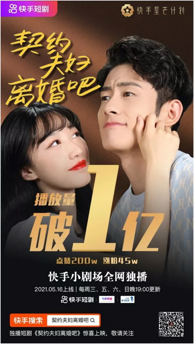 事实上,因为微短剧短小精悍,纯机器转化就已经基本可以满足片方需求,甚至可以不用人工介入,在这方面海马轻帆已经有不少成功案例。比如快手全网独播的《契约夫妇离婚吧》就是“小说转剧本”的短剧产品。自5月16日上线以来,该剧点赞超200W,涨粉45W+,短短1个月时间播放量更是突破了1亿。