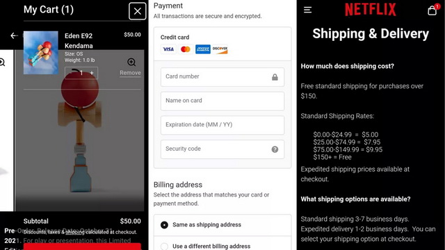 在购买方式上,Netflix.shop和奈飞原本的流媒体平台账号并不通用,非奈飞订阅用户也可以购买。配送则有标准配送和加急配送两种选择,前者大约3-7个工作日送达,后者1-2个工作日就能送达,不同的消费标准对应不同的运费,150美元以上可包邮。支付方式上目前只支持信用卡支付,消费者还可以选择勾选邮件推送,从而获得商品打折、促销优惠的信息。