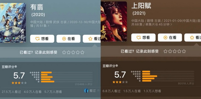 随着女性意识的觉醒和大IP剧的降温,生长于IP的大女主剧正在退出舞台中心,但《有翡》和《上阳赋》仍然“能打”,位列有效播放榜单前二十。不过二者都更像是“大女主剧”的特例,前者为赵丽颖复出首作,且有王一博为热度加持,后者则凭借着章子怡“下凡”堪堪稳住局面。但从口碑来看,两部剧的豆瓣评分都只有5.7。
