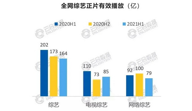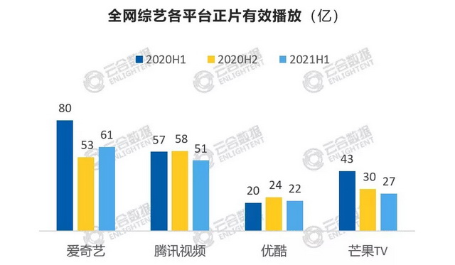 2021上半年,虽然有多部头部作品如《青春有你2021》《创造营2021》《吐槽大会第五季》,爱奇艺、腾讯视频正片有效播放分别为61亿、51亿,同比分别下滑24%、11%。