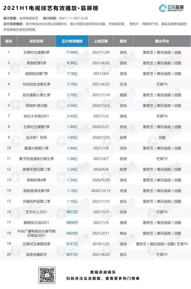 2021年上半年,综艺市场的大盘数据同比有所下滑,也没能诞生和去年同等规模的爆款。根据云合数据,四大平台上半年上新了100部国产季播综艺,比去年同期增加了2部,但从全网综艺正片有效播放164亿,相比去年的201亿不增反降,同比减少了19%。