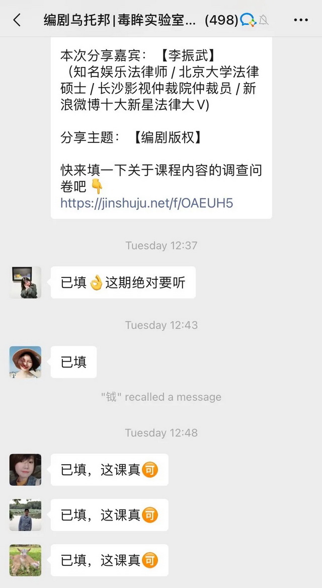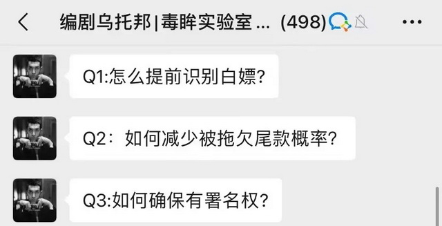怎么减少试稿创意被“白嫖”,怎么保护自己的“署名权”,违约如何举证,结算纠纷怎么处理……都是李振武老师会重点讲解的部分。群里有新人编剧曾向毒眸说,有时候明知道要定金是对的,要署名权是合理需求,却常常碍于对方的“江湖地位”不敢开口。这些“人情”的情况,李振武律师也会教大家怎么从法律的角度巧妙争取。