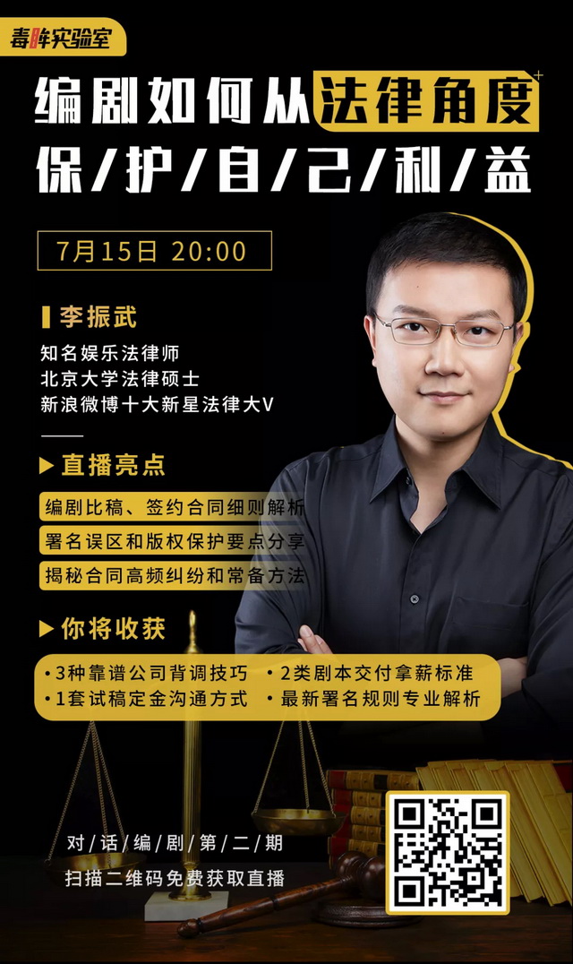 如果想要培养自己的“法商”,不妨来毒眸创办的编剧社群,听听李振武律师的分享。