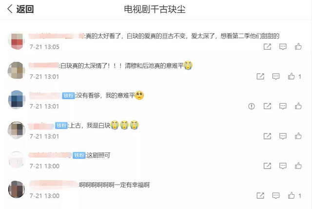 剧集的流量和热度也持续攀升,连续三天单日播放量破亿,连续3周蝉联微博电视剧榜第一,在播出接连期间在抖音、微博等多平台拿下117个热搜。超前点播结局后,还有不少人冲到了超话和官微下方,表示“想要第二季”“想看上古白玦婚后生活”。