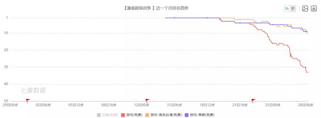 目前,漫威超级战争热度呈下滑趋势,后劲明显不足。图源:七麦数据