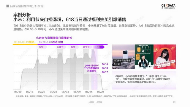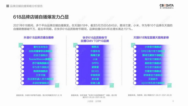 今年618,多个平台的品牌店铺自播带货力爆发。根据天猫数据,截至5月25日0点45分,雅诗兰黛、小米、华为等10个品牌的自播预售金额就已突破千万元,超去年同期。在快手“616品质购物节”中,品牌店铺自播的GMV环比增长高达151%。