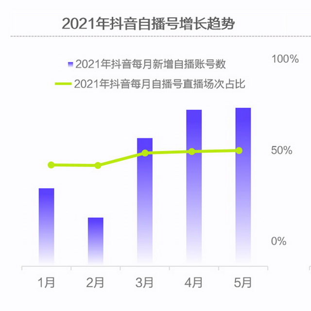 2021年伊始,抖音平台的品牌店铺自播号就呈现出高速增长趋势,开播场次占比也逐渐提升。《报告》显示,到了5月,抖音上品牌店铺自播账号的开播次数占比已经接近50%。