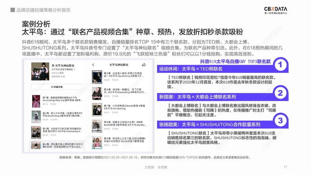 太平鸟女装在618期间每日开播2-4次,几乎覆盖全天。除了采用高频开播触达用户之外,太平鸟女装的“杀手锏”在于联名。根据果集数据,太平鸟女装自播销量最高的15件单品中,有3件都是联名款,分别是TED熊、大都会上博、SHUSHUTONG系列。太平鸟女装对于联名款的种草引流也值得关注,其专门设置了“太平鸟神仙联名”短视频合集,除了常规的产品展示外,为了增加看点,部分视频还设计了剧情。