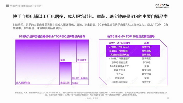 快手上的自播强势品类是成人服饰鞋包,总GMV占到所有品类的60%以上,其次是童装和珠宝钟表。快手自播号中工厂店居多,本次618期间,其自播GMV TOP 10品牌有超过一半都是工厂店。