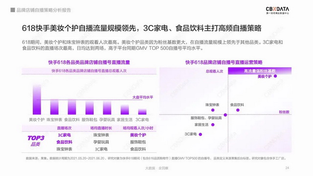 尽管美妆个护并不是快手上的主力自播品类,但随着完美日记、欧诗漫等国货品牌加入,其直播流量和用户规模正逐渐增长。CBNData《报告》显示,今年618期间,美妆个护成为自播观看人次最高的品类,且远高于大盘平均水平。