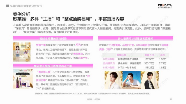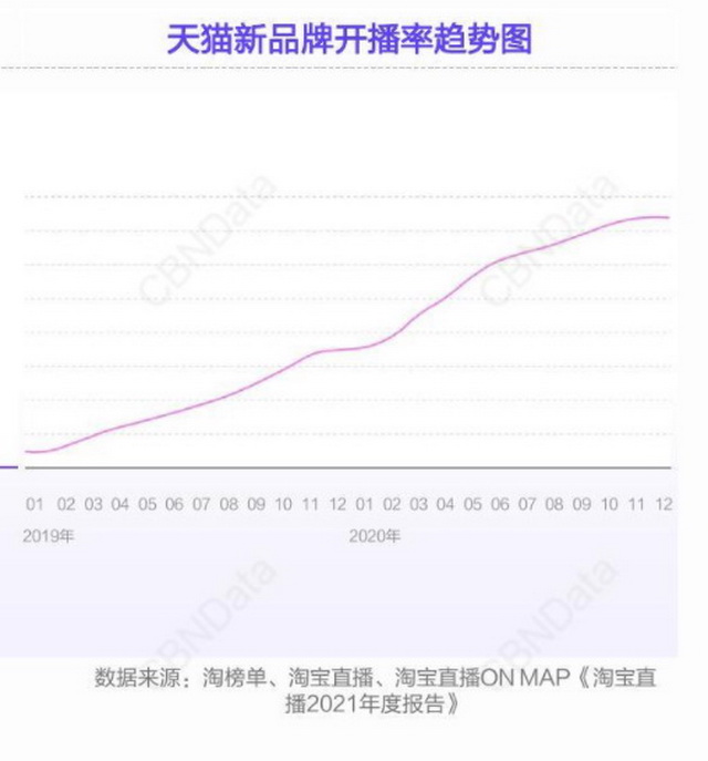 品牌店铺自播一直是天猫扶持的重点。《淘宝直播2021年度报告》显示,2019年以来,天猫新品牌的开播率就在逐渐提升。2020年11月,在淘宝产品升级直播发布会上,玄德表示直播将成为店铺标品。淘宝直播正降低门槛吸引更多店铺参与,通过技术赋能店铺直播,比如利用AI技术等。大促期间,欧莱雅、OLAY、兰蔻均启用AI主播,覆盖0-8点的深夜时段,满足消费者深夜购买需求。