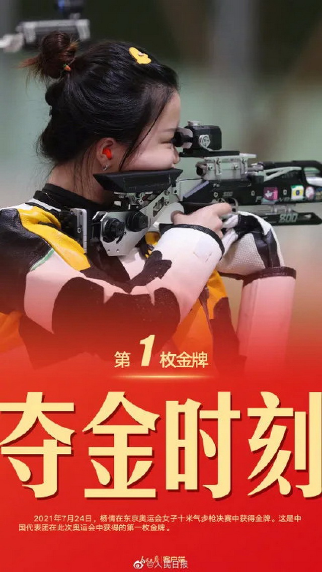 7月24日,在东京奥运会女子10米气步枪决赛上,来自清华大学的杨倩一举夺冠,拿下了东京奥运会首金。随后相关话题#杨倩摘得东京奥运首金#登上微博热搜,引发广大网友激动地讨论,话题浏览量达到了24.3亿,讨论量也达到了370.9万。