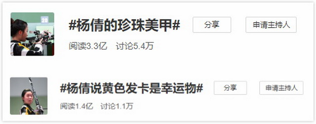 除此之外,我们还发现,杨倩夺金登上热搜后,她的小黄鸭发夹、珍珠美甲也被网友们发现,先后登上了热搜。截至目前,话题#杨倩的珍珠美甲#和#杨倩说黄色发卡是幸运物#的浏览量分别达到了3.3亿和1.4亿。