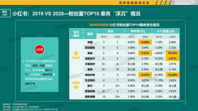 克劳锐《2021年看得见的粉丝价值--五大平台KOL粉丝分析研究报告》也表明,从2019年到2020年,小红书平台美妆类KOL数量占比从31.9%下降到13.68%,美食、运动健身类KOL数量则分别从6.8%,1.2%上涨至10.03%,2.55%,相应的粉丝量占比也有所提升。