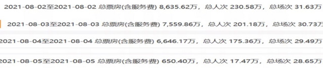 就在各地影院停业通知集中发布的这几天,国内单日人次及总场次也在发生着变化:拓普数据显示,8月2日(周一)单日总人次230.58万,等到8月4日,总人次下降到175.36万,总场次在2日之间也减少了2.14万场。