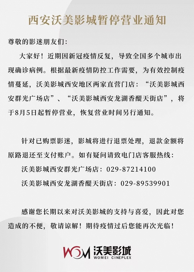 8月4日,据华商报消息,西安多家影院负责人在下午5点左右接到上级部分通知,即日起西安市区全部影院关闭。当日西安市内的奥斯卡、万达、沃美、苏宁等影城均发布停业公告。