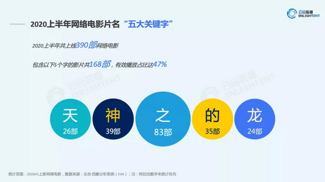 如果单看常用字,网络电影在2020年上半年由于疫情广受外界关注,云合数据《2020上半年网络电影复盘》专门统计了“片名五大关键字”,报告显示,“之”、“神”、“的”、“天”、“龙”按从高到低的顺序最常出现,包含这五个字的影片有效播放占所有影片47%。