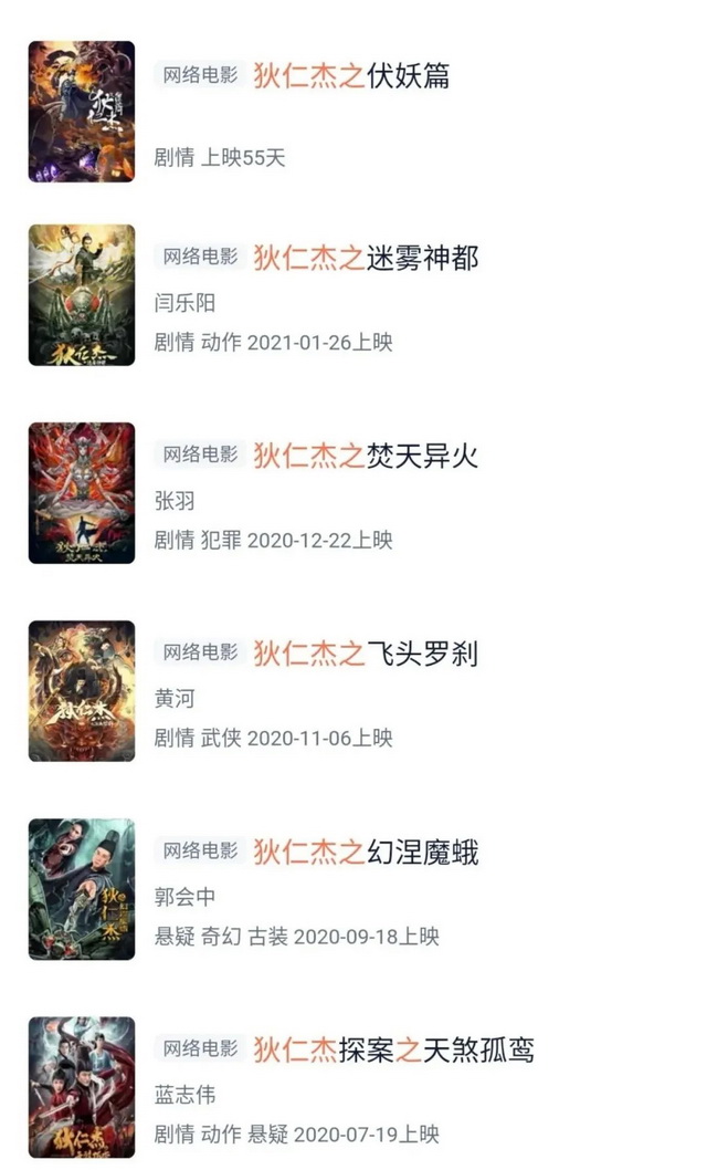 在灯塔专业版中搜索“网络电影狄仁杰”得到的部分结果