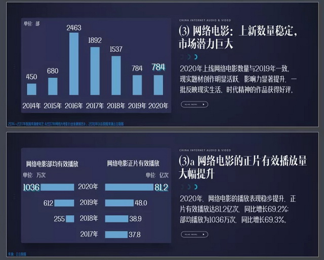 上述报告就显示,网络电影的“正片有效播放量”在2020年大幅提升,达81.2亿次,同比增长了69.2%。