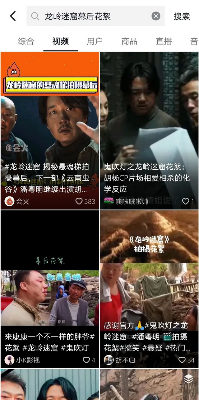 在抖音中搜索“龙岭迷窋幕后花絮”的部分结果