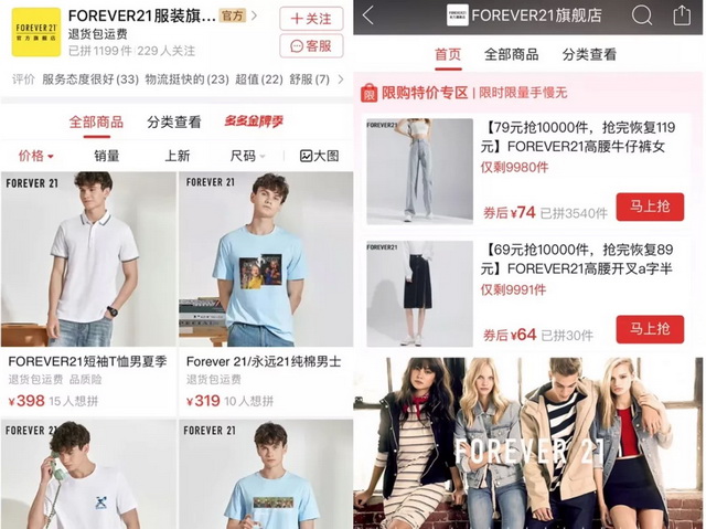 左:Forever 21拼多多男装旗舰店;右:Forever 21拼多多女装旗舰店