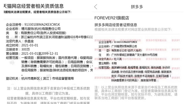 「电商在线」发现,Forever 21的官博运营主体是旭声电器,而它在拼多多、唯品会和天猫上的运营公司都另有其人,且分别是毫无关联的几家公司。
