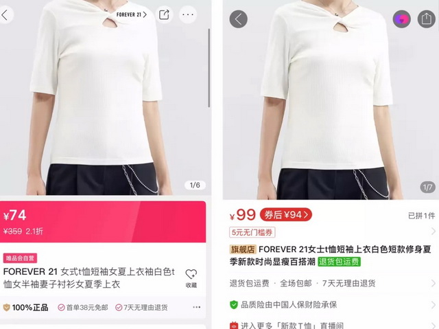 Forever 21唯品会店与拼多多店售卖的服装有部分重叠,但价格差异巨大:譬如一件胸口女生半袖,唯品会价格是74元,而拼多多则标价99元。另一条高腰爱心牛仔裤,两家平台也有4元的价格差。