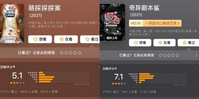 云合数据显示,2021年上半年网络综艺的有效播放表现中,《明侦6》以4.59亿的有效播放位列第四,比它晚播五个月、定位是“合家欢”的《萌探探探案》“后来居上”,揽获3.05亿有效播放,仅仅落后一名,但前者的豆瓣评分是8.6,后者仅有5.1。